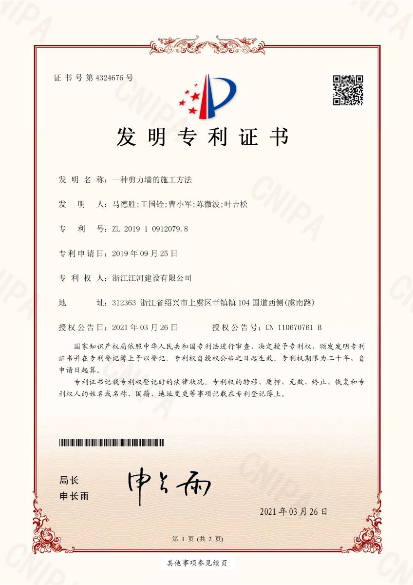 其中《一種剪力墻的施工方法》的發明專利涉及高層建筑施工的技術領域,本發明避免了大面積混凝土的澆筑,降低了混凝土凝固過程中所產生的熱量,提高剪力墻施工完成后期表面的平整度,同時提高了施工效率。